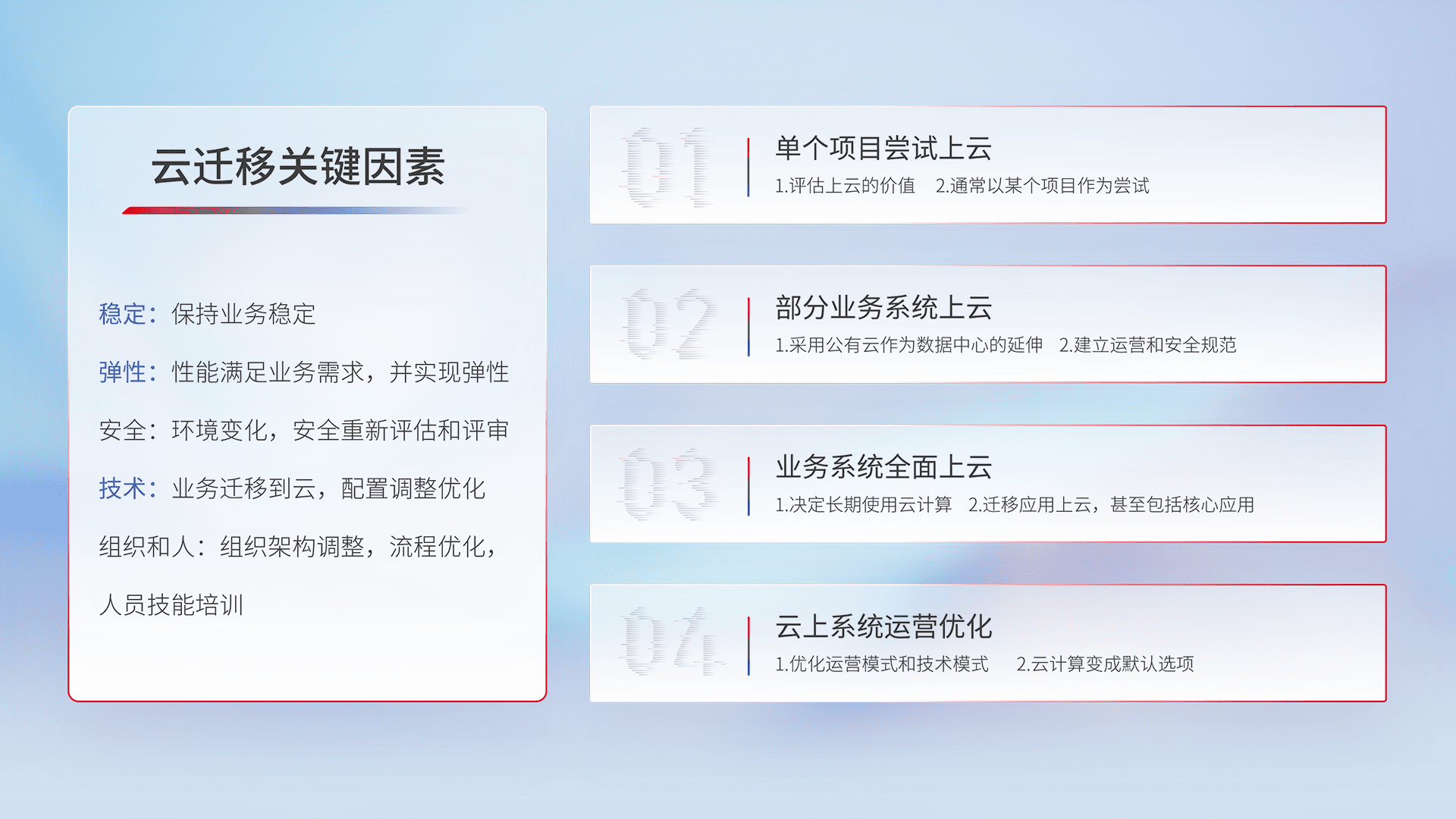 结合实际业务,,从规划设计、、、云平台选型、、、云原生改造、、数据迁移、、、、集成交付,,迁移全过程为客户识别最佳上云路径,,做好风险识别管理,,,,设计网络架构、、、身份权限、、、、安全审计合规、、、操作审计、、、、日志审计、、、、监控告警策略、、多站点容灾设计等,,对云上基础设施进行整体规划,,,提升IT治理水平,,以满足弹性、、、高可用、、、高性能的需求。。。。