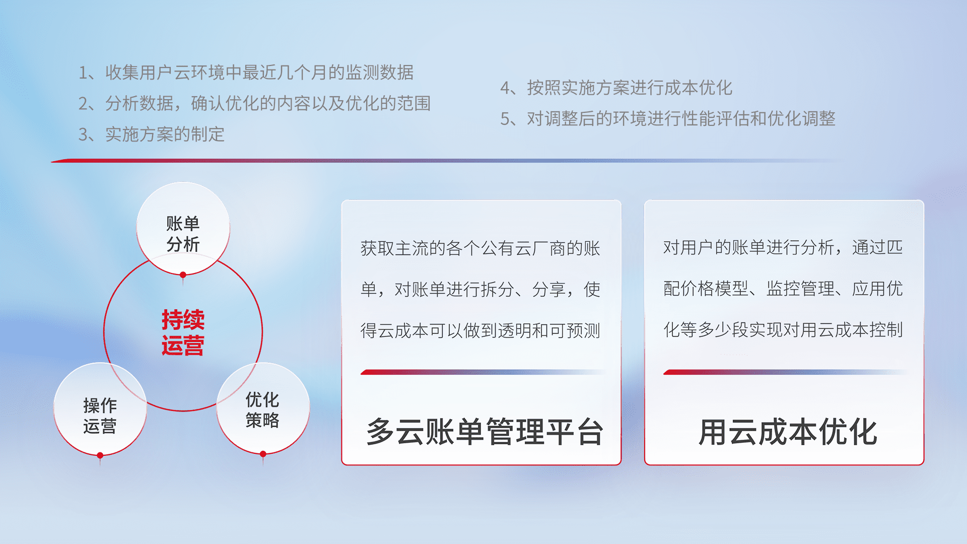 通过多云纳管,,,以统一的资源数据模型把客户的云资源进行抽象和封装,,进而实现对多云资源的统一操作,,,保障云资源管理的可靠性、、、稳定性与可用性。。。。量身定制化运维内容,,配置、、、、开发运维、、、、补丁管理、、、、备份、、监控、、、认证和访问管理、、审计和日常巡检等,,保障在用云过程中的可靠度,,,稳定度以及高可用率。。。